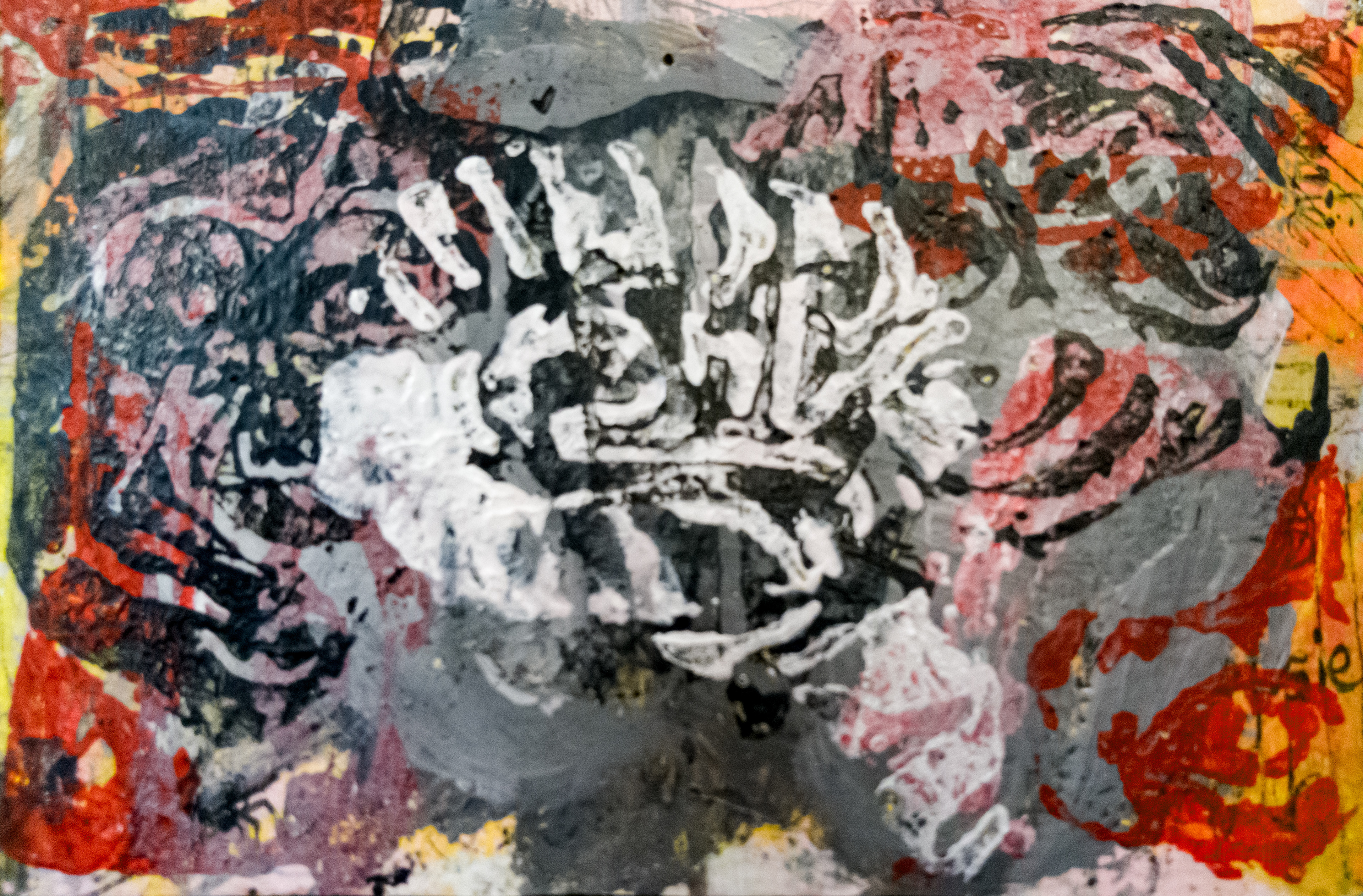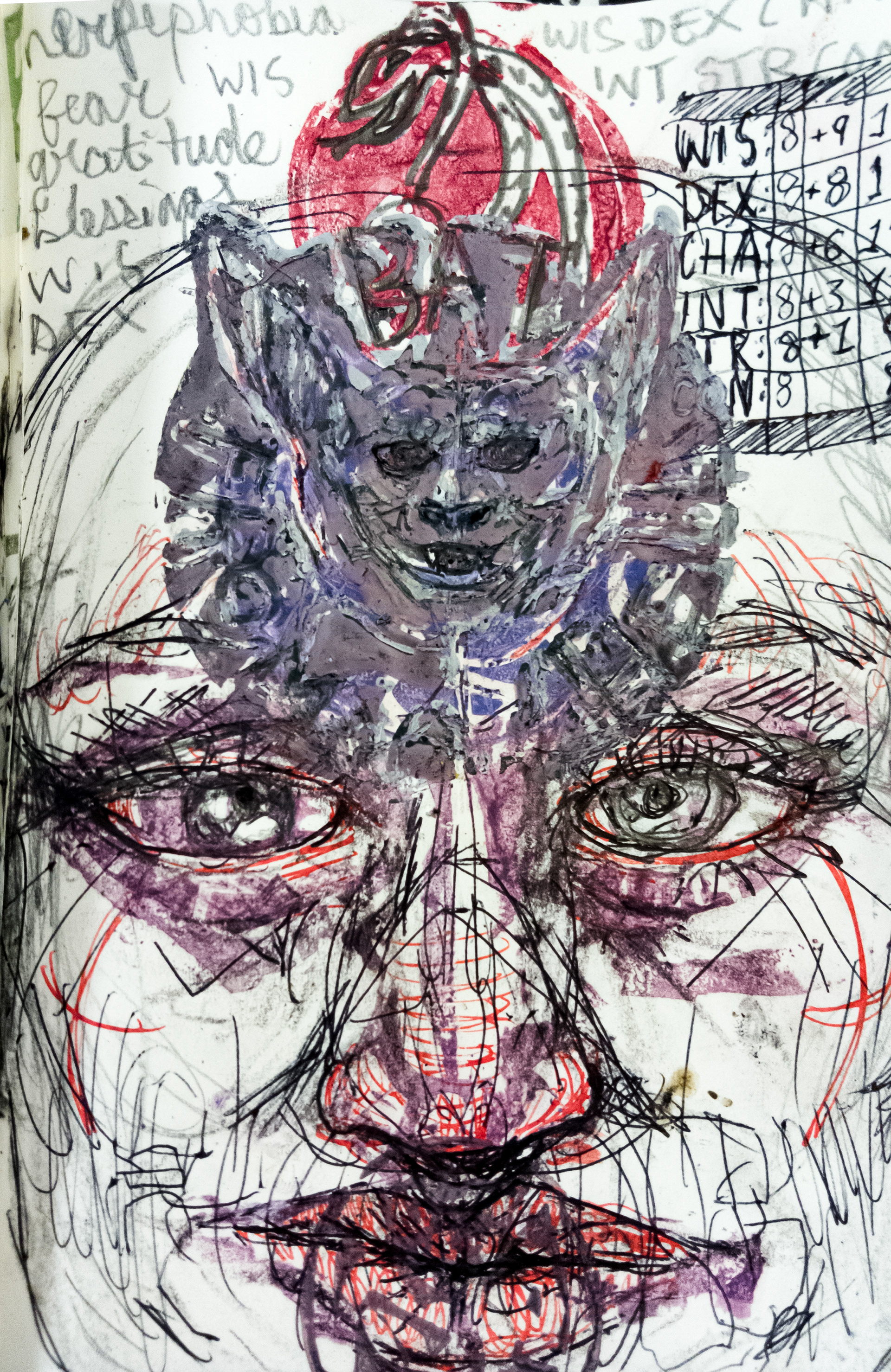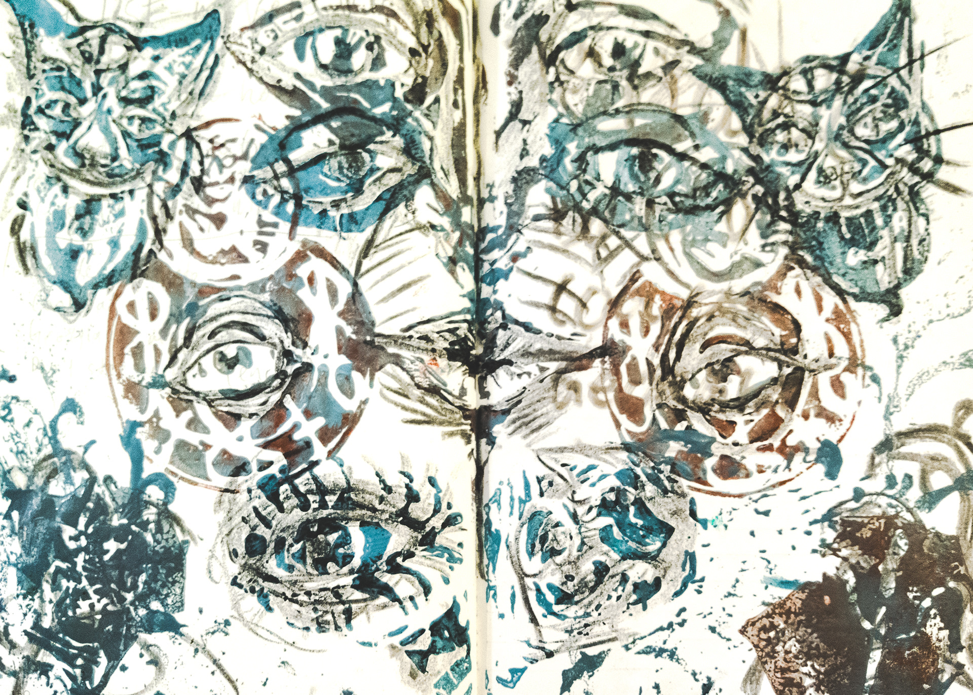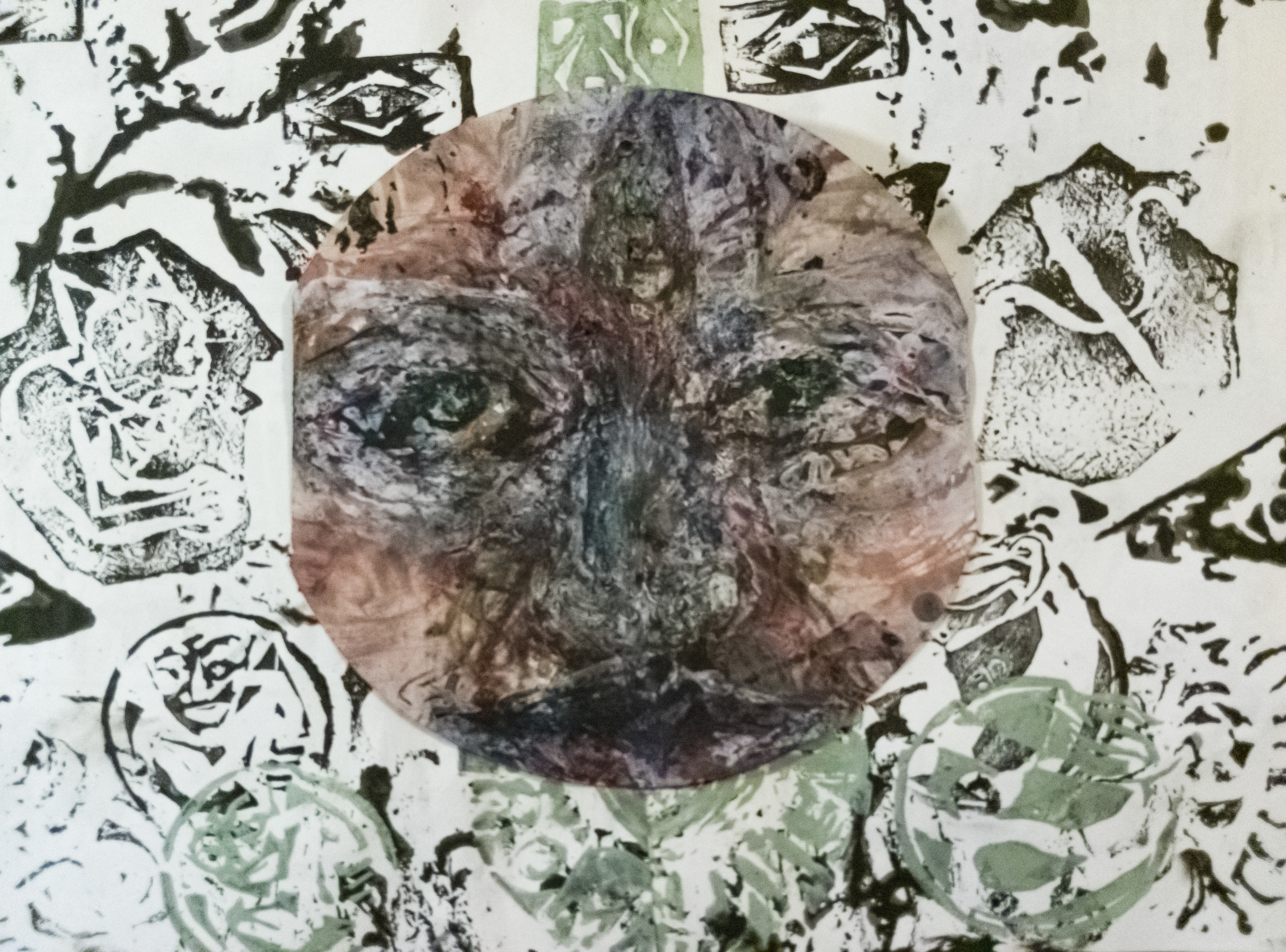 Illustrations made using mixed traditional painting methods and linocut stamps
